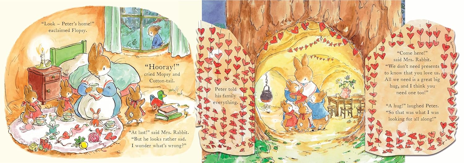 Peter's sisters are making paper hearts to show how much they love their family but, try as he might, Peter just can't seem to get his paper hearts right - so he sets off from the burrow to find the perfect gifts to show his family just how much he loves them. With the help of some friends along the way, Peter digs for buried treasure, chooses sweet treats and finds an acorn that will keep on growing, just like his love.