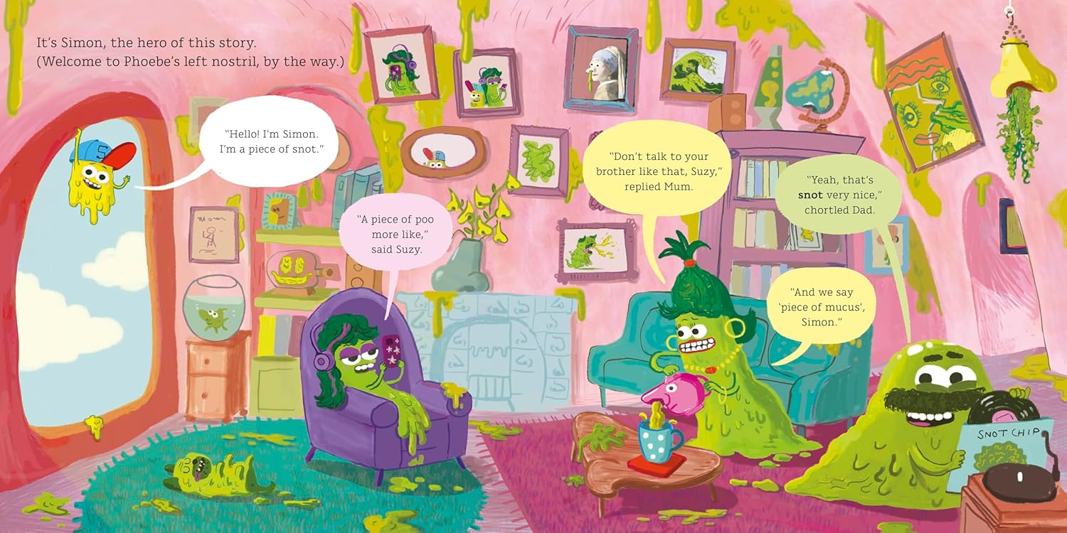 Meet Simon. Simon is the hero of this story. But unlike most heroes in most stories, Simon is a piece of snot. He lives with his family in the left nostril of a girl called Phoebe.