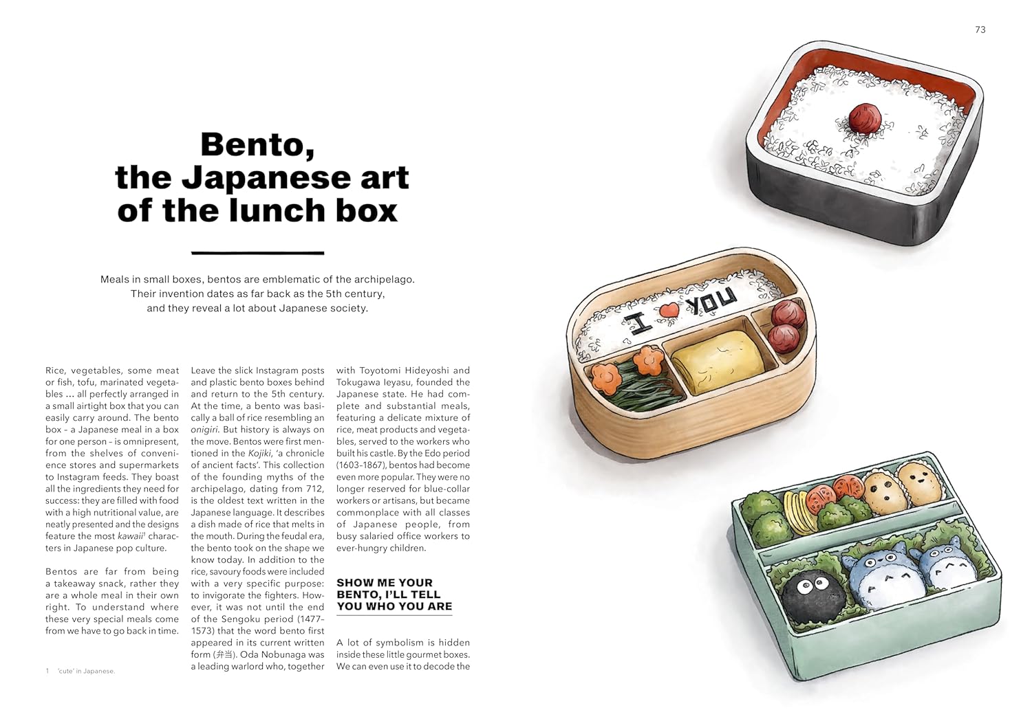 The eye-catching book, produced in the Japanese style, on uncoated fine art paper with a cardboard cover and a paper dustjacket, is brimming with photographs and illustrations, and features an abundance of information on a variety of topics— from the symbolism of bento boxes; Osaka’s street food marvels; Kyoto’s Nishiki Market; a celebration of Japanese sweets; a deep dive into dashi; and an introduction to the Ainu people.
