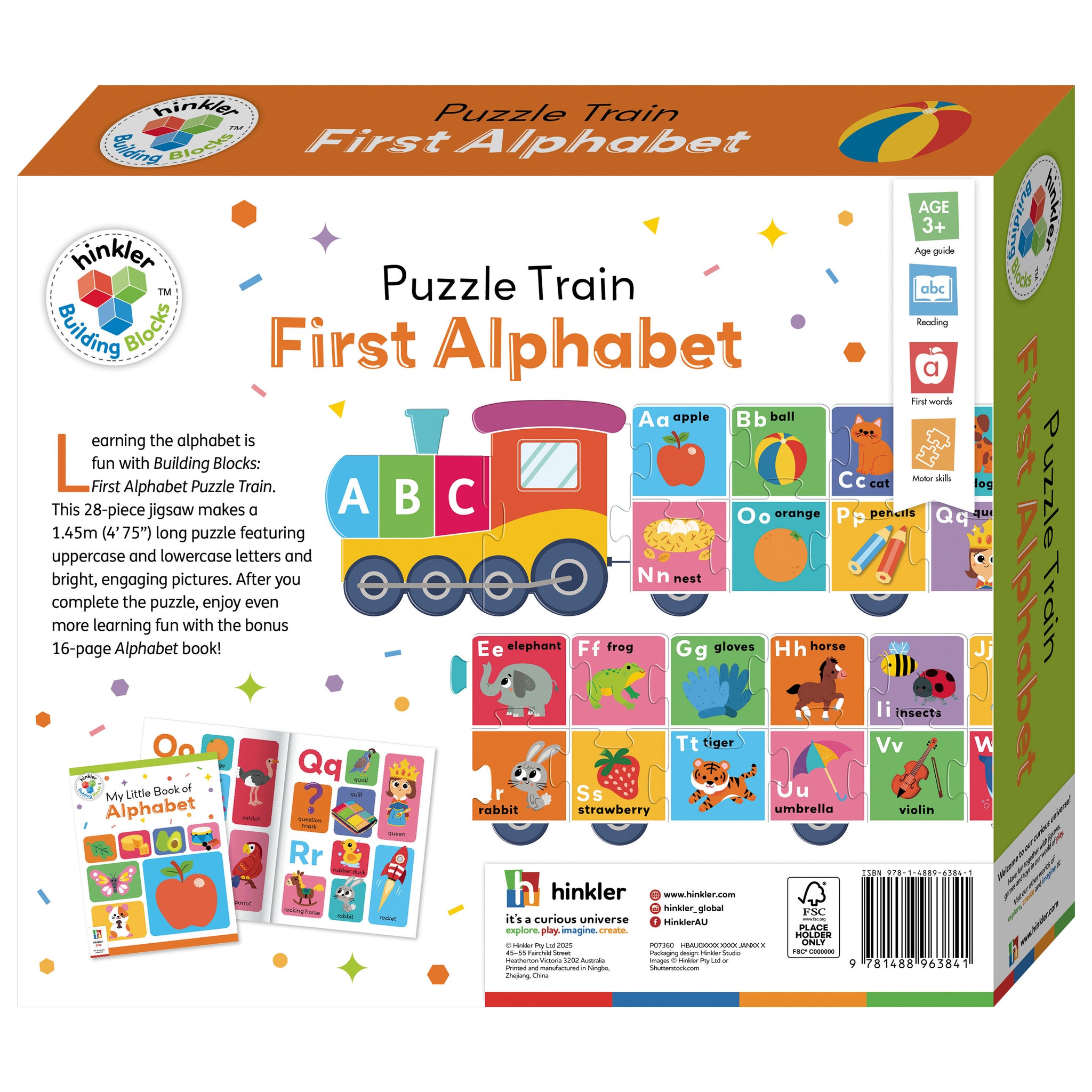 This modern and immersive puzzle is supported by a 16-page alphabet book!