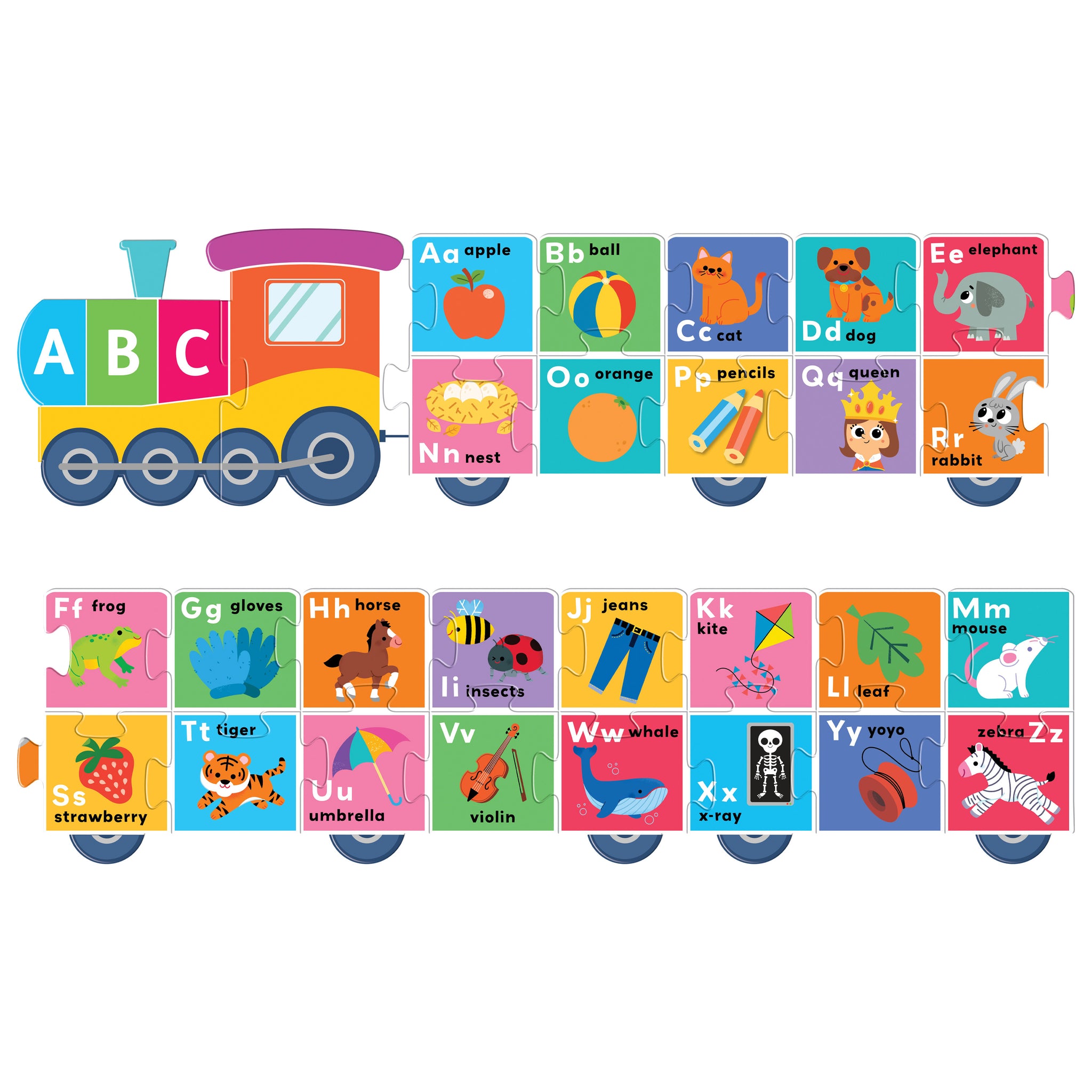 This 28-piece jigsaw makes a large 145-cm long (57-in long) train puzzle featuring upper-case and lower-case letters and bright, engaging pictures.