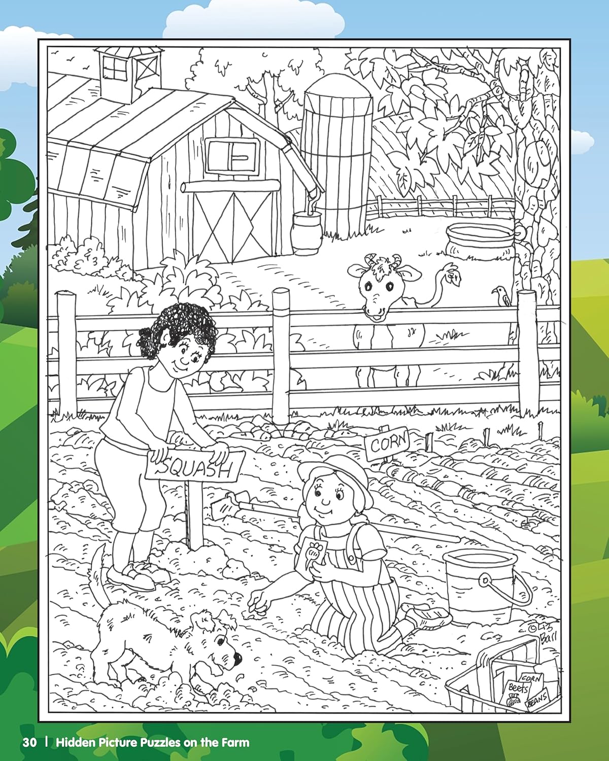 Hidden Pictures on the Farm is filled with 50 black and white hidden puzzle pictures — all from around the farm!