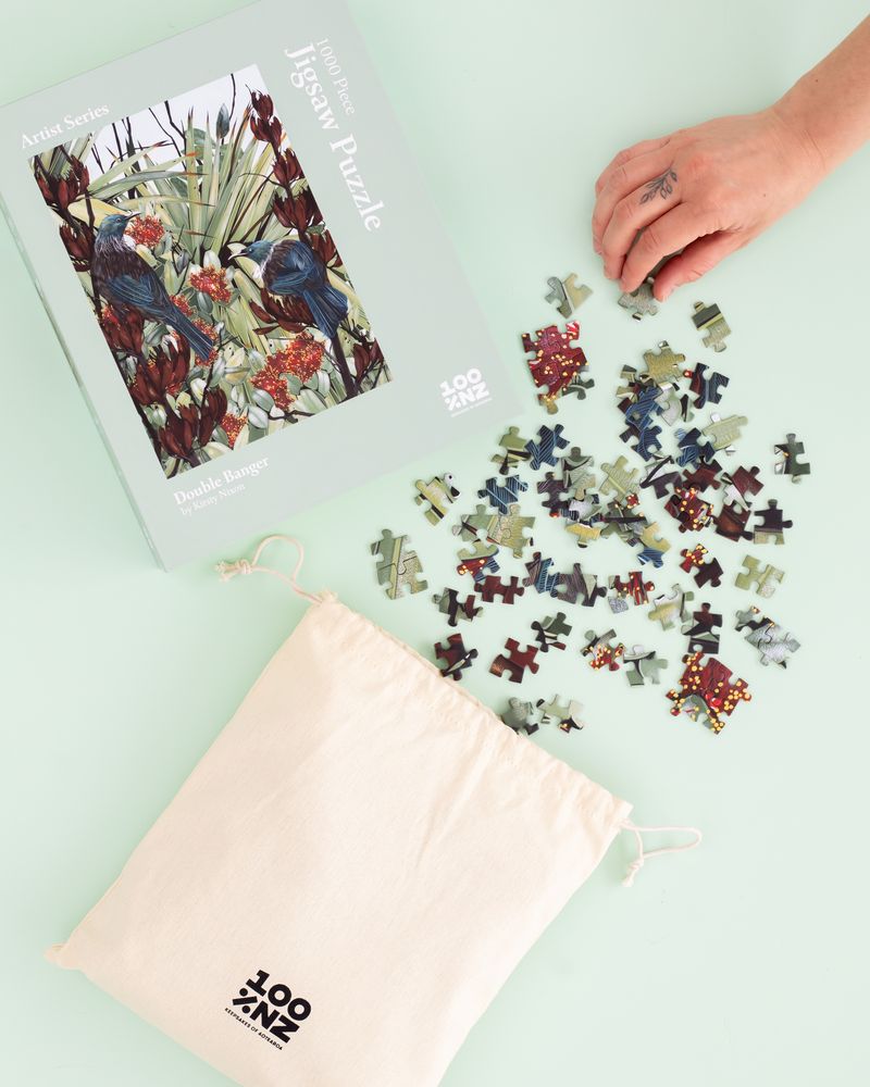 Discover the vibrant energy of New Zealand’s birdlife with our Artist Series 1000-piece jigsaw puzzle, Double Banger by Kirsty Nixon.