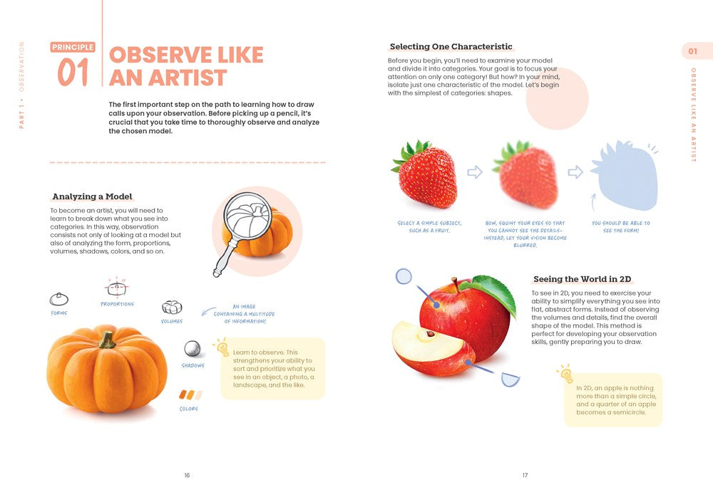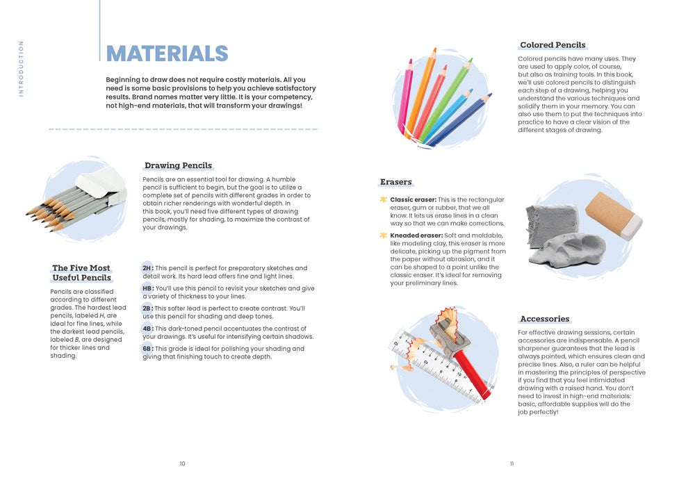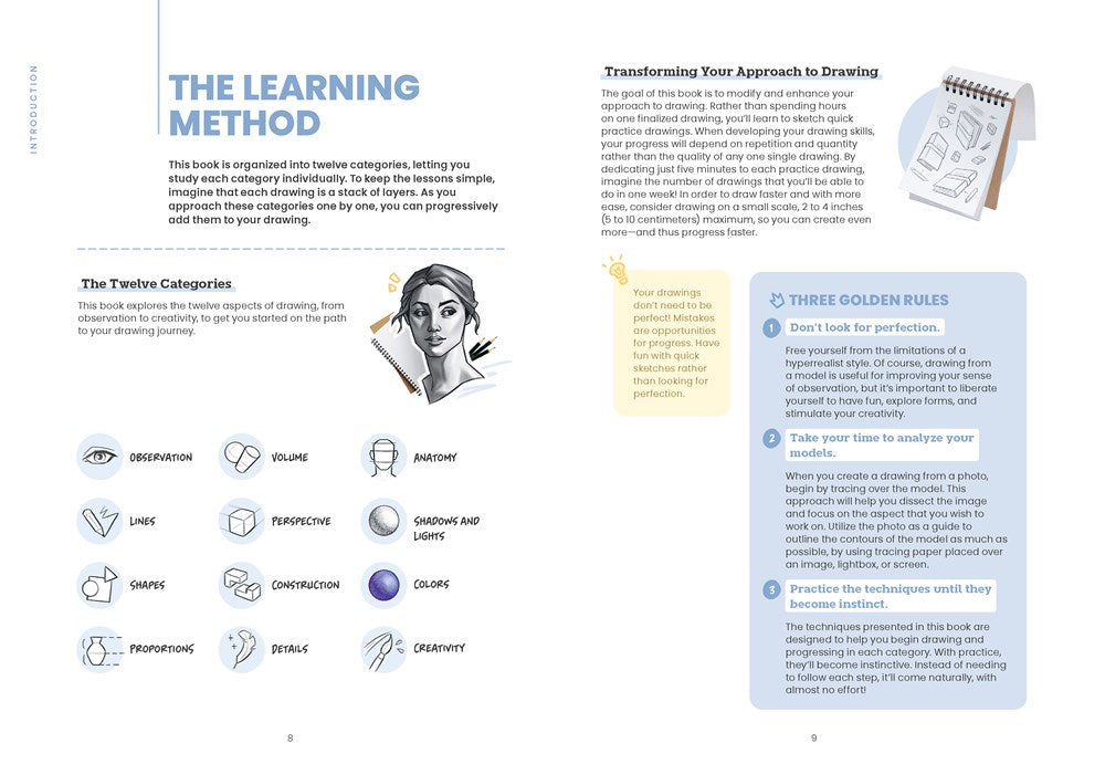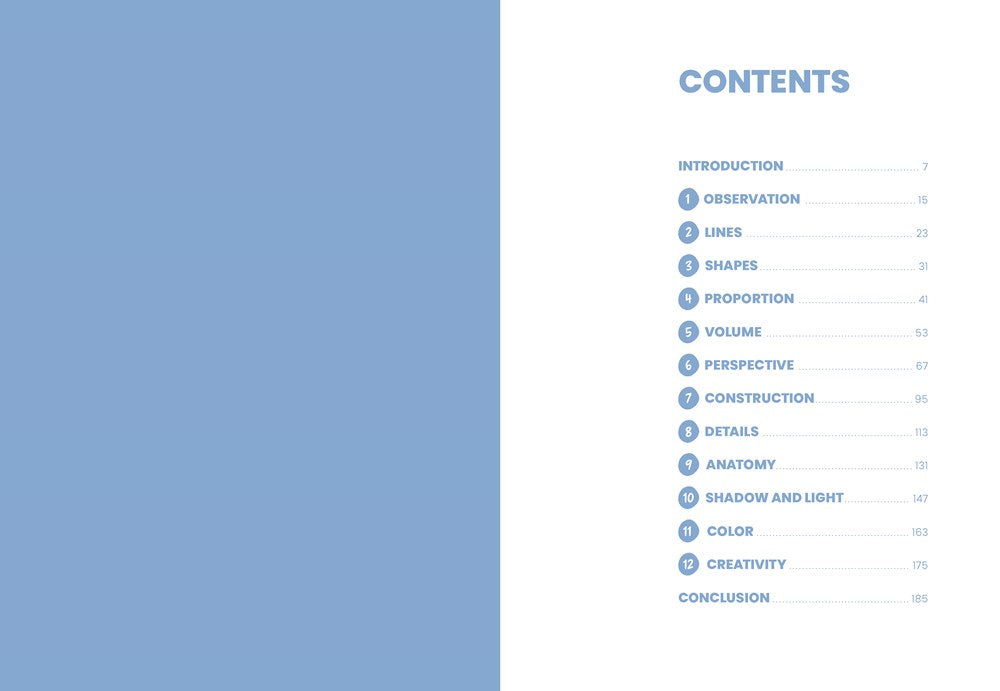 - Essential drawing techniques: Follow step-by-step instructions for basic skills that form the building blocks of artistic expression, including observation, proportions, perspective, details, light and shadow, and creativity.