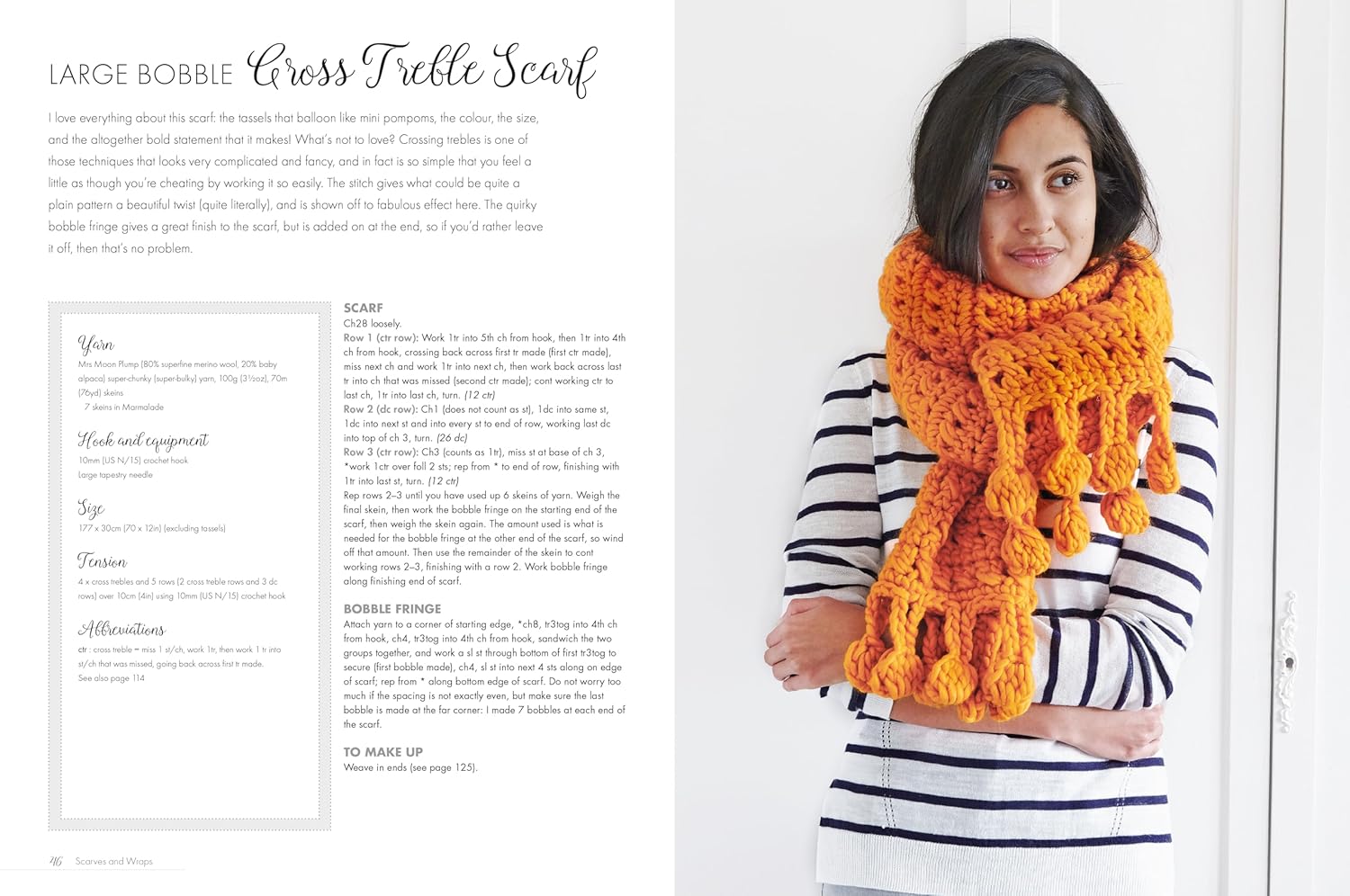 Many of the pieces are perfect for beginners, such as a chevron throw, a simple beanie, or a snuggly cowl. Other projects introduce textured stitches so you can expand your skills with the help of the techniques section. Choose to make a delicately lacy ombré scarf, a granny-square coatigan or a giant cuddly owl.
