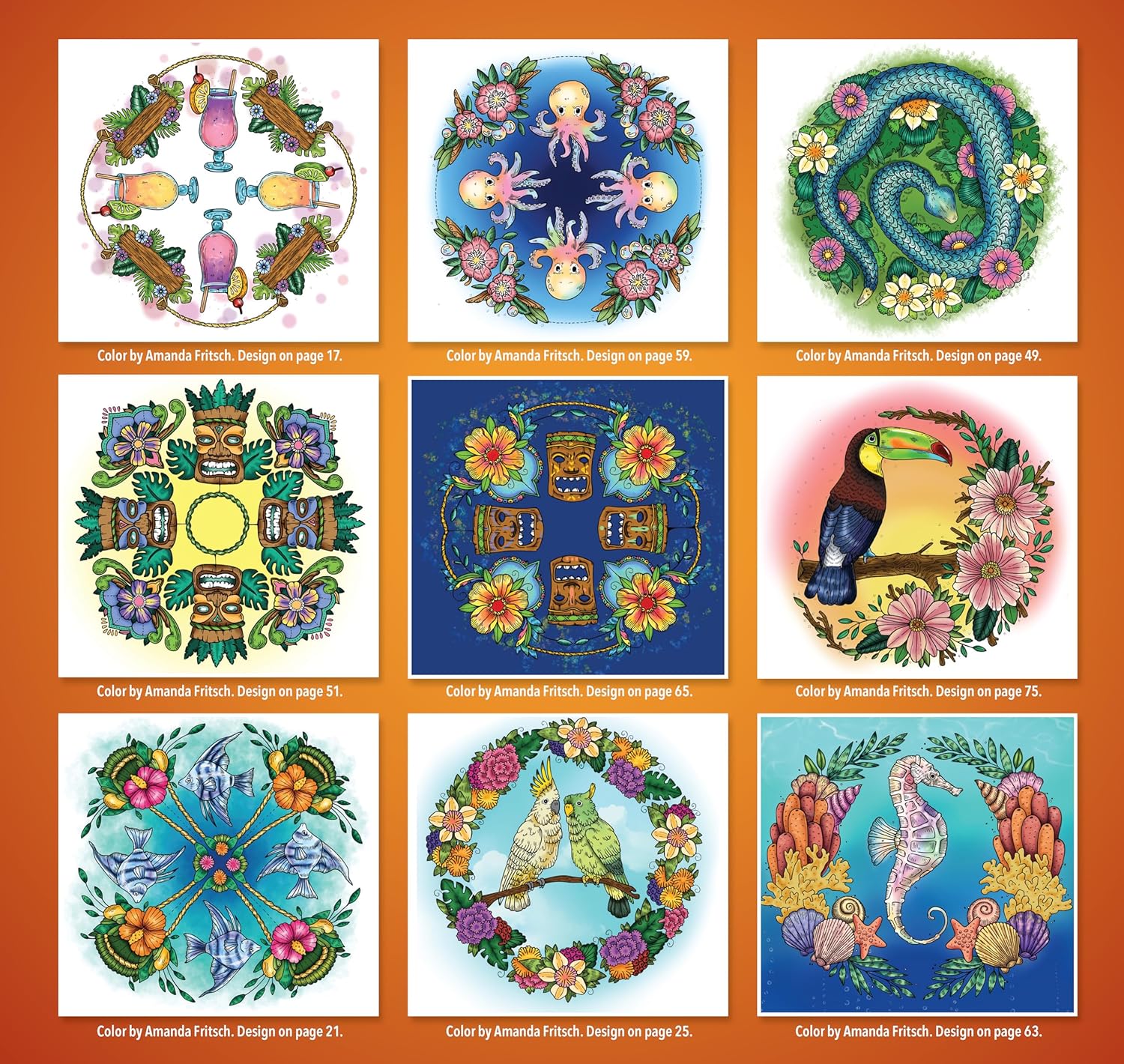 Renowned for her intricately detailed art, the book features 40 tropical and floral themed designs. From tikis and lobsters to starfish, flamingos, and tropical libations you'll feel as though you've been whisked away to your own tranquil island.